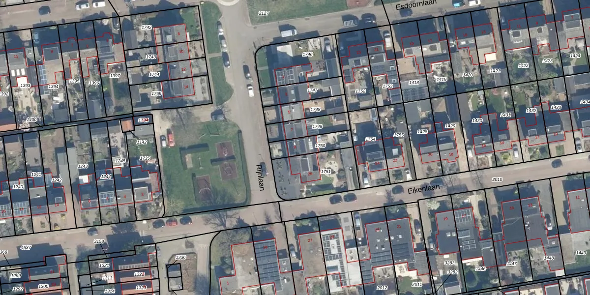 Het perceel waarop Rijnlaan 9 staat heeft een oppervlakte van 169 m². Dit is een middelgroot perceel. De perceeloppervlakte wordt geregistreerd door het Kadaster. Gedetailleerde informatie over de maten van dit perceel kunt u vinden in het rapport Kadastrale kaart met maatvoering van Rijnlaan 9.