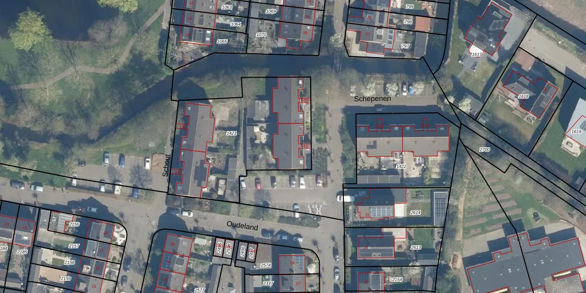 Het perceel waarop Schepenen 11 staat heeft een oppervlakte van 1545 m². Dit is een zeer groot perceel. De perceeloppervlakte wordt geregistreerd door het Kadaster. Gedetailleerde informatie over de maten van dit perceel kunt u vinden in het rapport Kadastrale kaart met maatvoering van Schepenen 11.