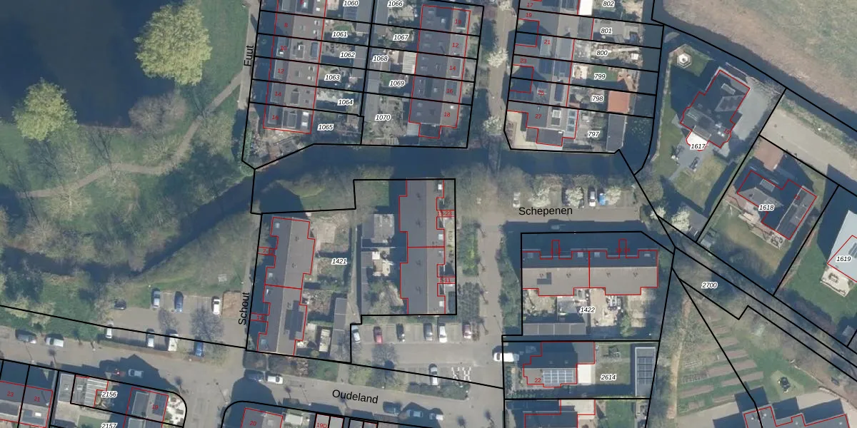 Het perceel waarop Schepenen 21 staat heeft een oppervlakte van 1545 m². Dit is een zeer groot perceel. De perceeloppervlakte wordt geregistreerd door het Kadaster. Gedetailleerde informatie over de maten van dit perceel kunt u vinden in het rapport Kadastrale kaart met maatvoering van Schepenen 21.