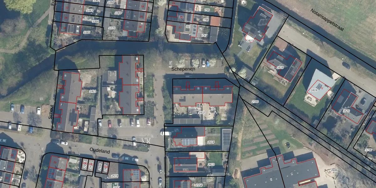 Het perceel waarop Schepenen 4 staat heeft een oppervlakte van 855 m². Dit is een groot perceel. De perceeloppervlakte wordt geregistreerd door het Kadaster. Gedetailleerde informatie over de maten van dit perceel kunt u vinden in het rapport Kadastrale kaart met maatvoering van Schepenen 4.