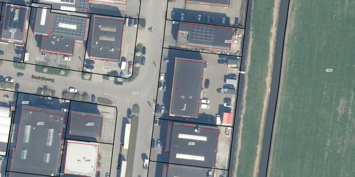 Het perceel waarop Techniekweg 10 staat heeft een oppervlakte van 1802 m². Dit is een zeer groot perceel. De perceeloppervlakte wordt geregistreerd door het Kadaster. Gedetailleerde informatie over de maten van dit perceel kunt u vinden in het rapport Kadastrale kaart met maatvoering van Techniekweg 10.