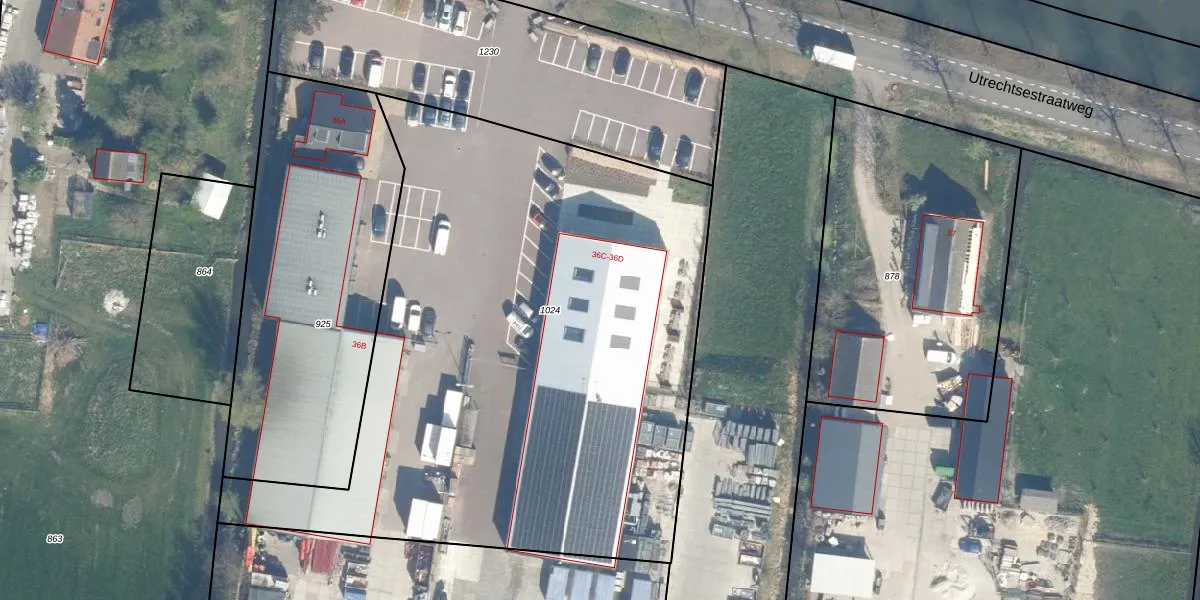 Het perceel waarop Utrechtsestraatweg 36-C staat heeft een oppervlakte van 3710 m². Dit is een zeer groot perceel. De perceeloppervlakte wordt geregistreerd door het Kadaster. Gedetailleerde informatie over de maten van dit perceel kunt u vinden in het rapport Kadastrale kaart met maatvoering van Utrechtsestraatweg 36-C.