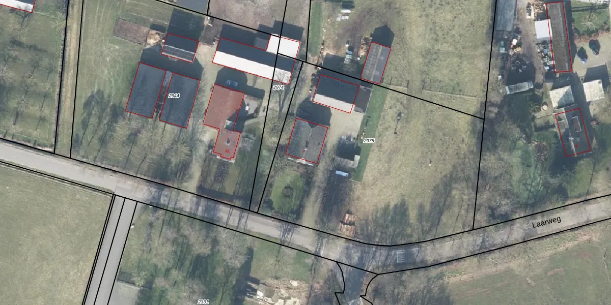 Het perceel waarop Laarweg 7 staat heeft een oppervlakte van 3265 m². Dit is een zeer groot perceel. De perceeloppervlakte wordt geregistreerd door het Kadaster. Gedetailleerde informatie over de maten van dit perceel kunt u vinden in het rapport Kadastrale kaart met maatvoering van Laarweg 7.