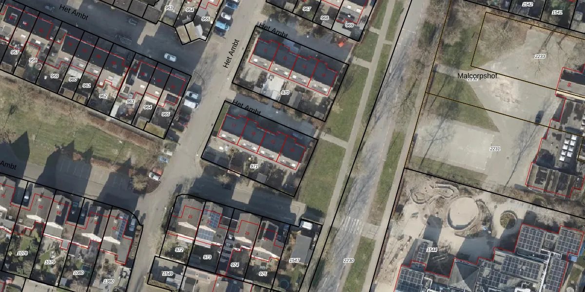 Het perceel waarop Het Ambt 23 staat heeft een oppervlakte van 725 m². Dit is een groot perceel. De perceeloppervlakte wordt geregistreerd door het Kadaster. Gedetailleerde informatie over de maten van dit perceel kunt u vinden in het rapport Kadastrale kaart met maatvoering van Het Ambt 23.