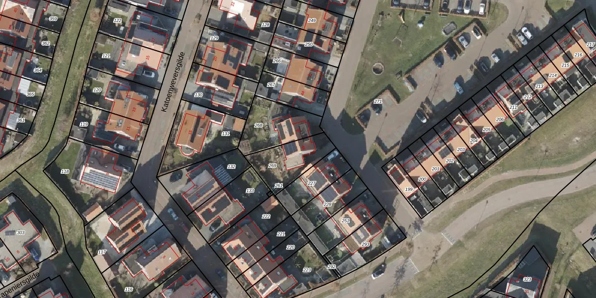 Het perceel waarop Katoenweversgilde 48 staat heeft een oppervlakte van 307 m². Dit is een groot perceel. De perceeloppervlakte wordt geregistreerd door het Kadaster. Gedetailleerde informatie over de maten van dit perceel kunt u vinden in het rapport Kadastrale kaart met maatvoering van Katoenweversgilde 48.