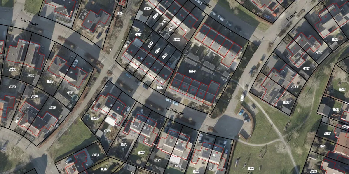 Het perceel waarop Landauer 28 staat heeft een oppervlakte van 1543 m². Dit is een zeer groot perceel. De perceeloppervlakte wordt geregistreerd door het Kadaster. Gedetailleerde informatie over de maten van dit perceel kunt u vinden in het rapport Kadastrale kaart met maatvoering van Landauer 28.