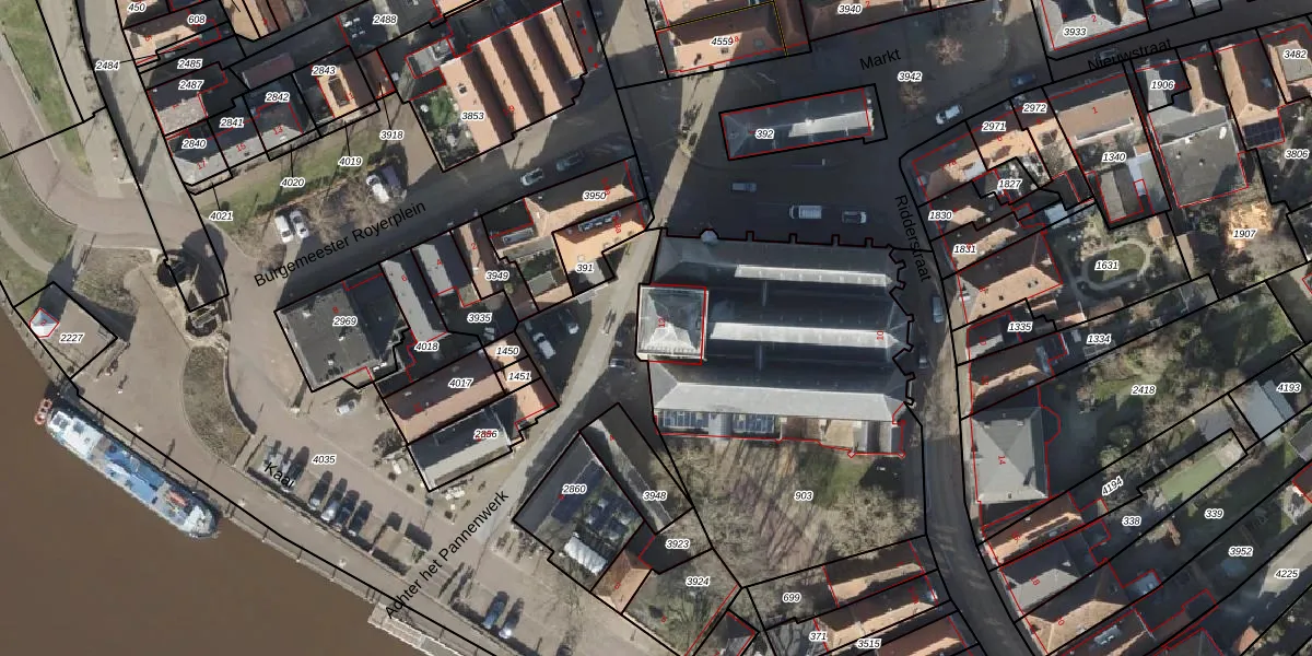 Het perceel waarop Markt 12 staat heeft een oppervlakte van 1905 m². Dit is een zeer groot perceel. De perceeloppervlakte wordt geregistreerd door het Kadaster. Gedetailleerde informatie over de maten van dit perceel kunt u vinden in het rapport Kadastrale kaart met maatvoering van Markt 12.