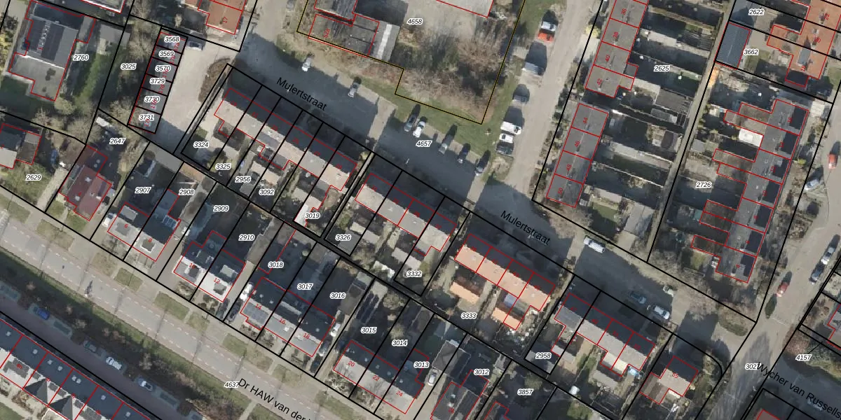 Het perceel waarop Mulertstraat 35 staat heeft een oppervlakte van 1738 m². Dit is een zeer groot perceel. De perceeloppervlakte wordt geregistreerd door het Kadaster. Gedetailleerde informatie over de maten van dit perceel kunt u vinden in het rapport Kadastrale kaart met maatvoering van Mulertstraat 35.