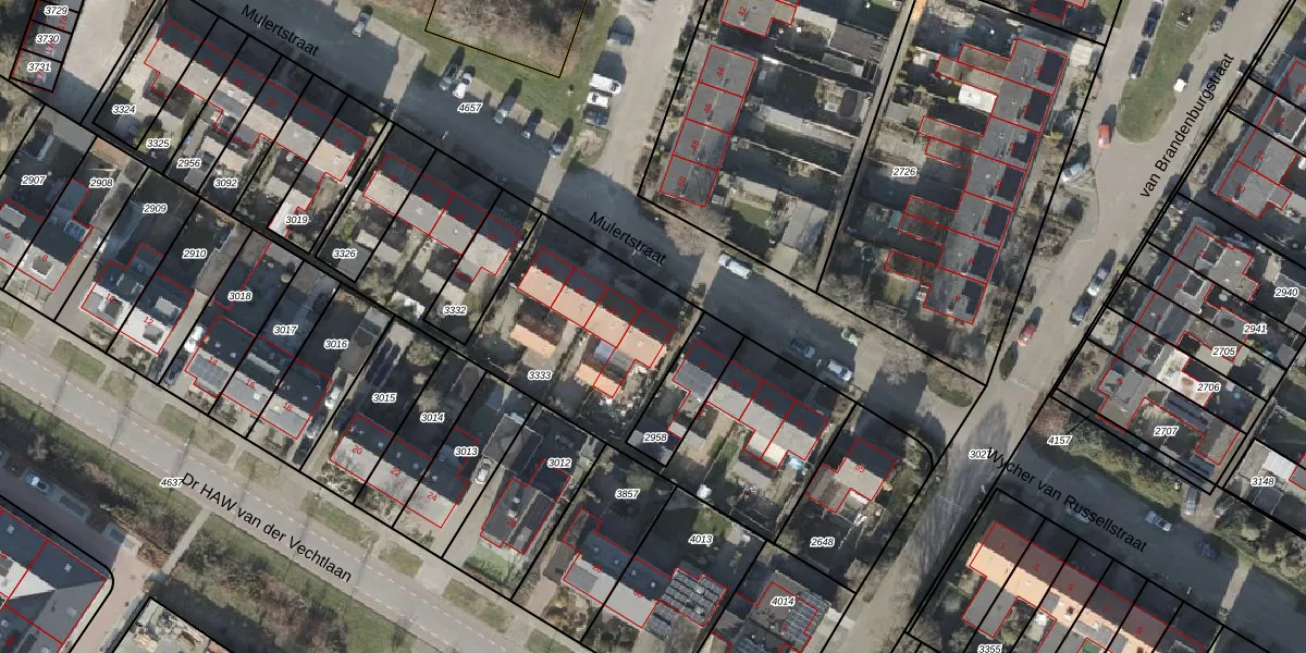 Het perceel waarop Mulertstraat 45 staat heeft een oppervlakte van 1738 m². Dit is een zeer groot perceel. De perceeloppervlakte wordt geregistreerd door het Kadaster. Gedetailleerde informatie over de maten van dit perceel kunt u vinden in het rapport Kadastrale kaart met maatvoering van Mulertstraat 45.