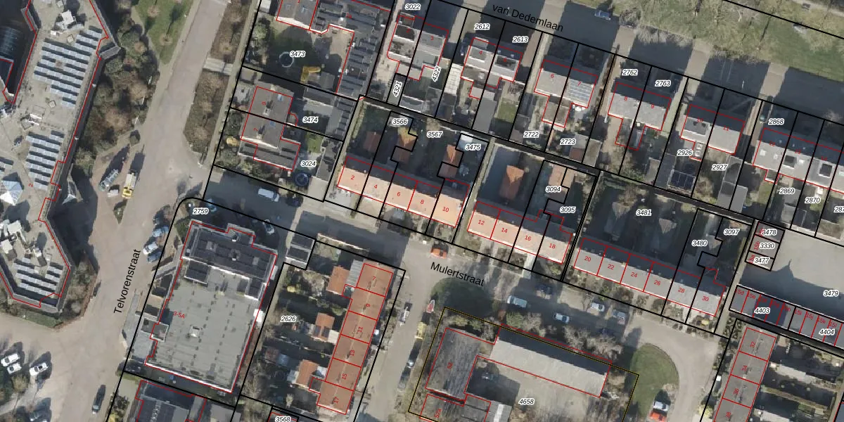 Het perceel waarop Mulertstraat 8 staat heeft een oppervlakte van 951 m². Dit is een groot perceel. De perceeloppervlakte wordt geregistreerd door het Kadaster. Gedetailleerde informatie over de maten van dit perceel kunt u vinden in het rapport Kadastrale kaart met maatvoering van Mulertstraat 8.
