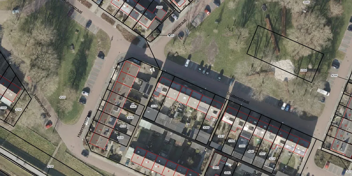 Het perceel waarop Ruitenstraat 3 staat heeft een oppervlakte van 6118 m². Dit is een zeer groot perceel. De perceeloppervlakte wordt geregistreerd door het Kadaster. Gedetailleerde informatie over de maten van dit perceel kunt u vinden in het rapport Kadastrale kaart met maatvoering van Ruitenstraat 3.