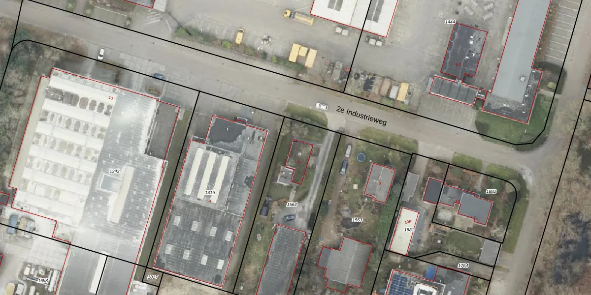 Het perceel waarop 2e Industrieweg 6 staat heeft een oppervlakte van 1247 m². Dit is een zeer groot perceel. De perceeloppervlakte wordt geregistreerd door het Kadaster. Gedetailleerde informatie over de maten van dit perceel kunt u vinden in het rapport Kadastrale kaart met maatvoering van 2e Industrieweg 6.