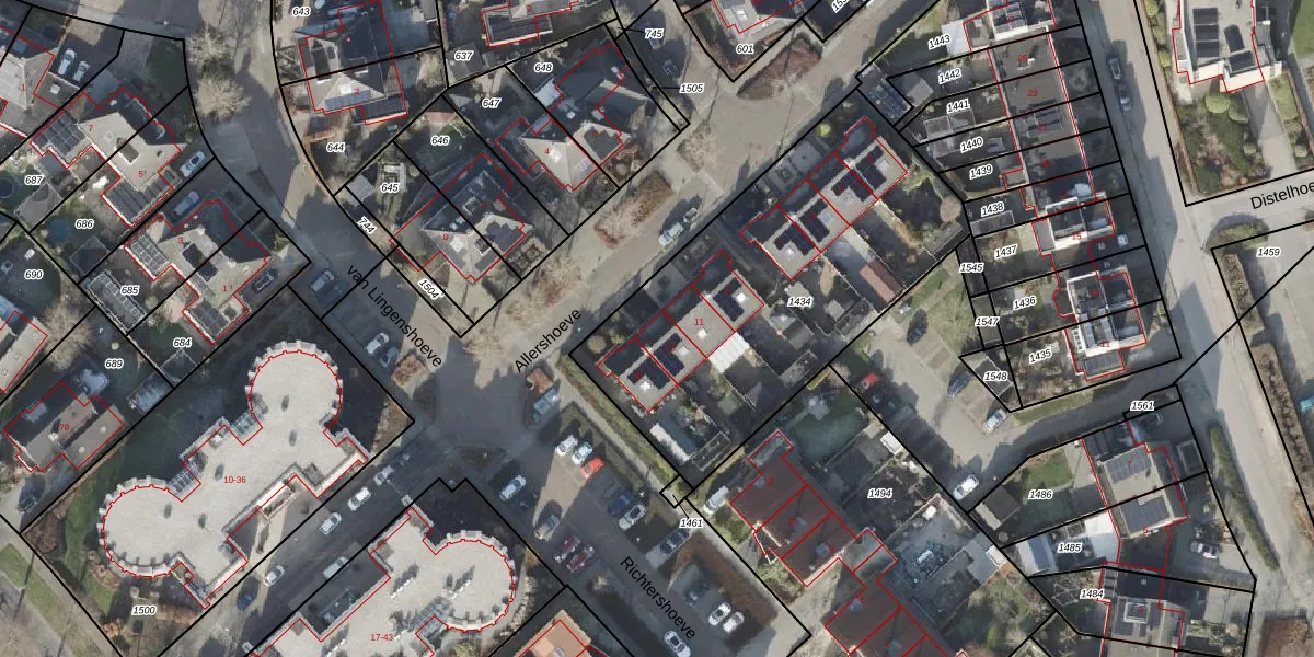 Het perceel waarop Allershoeve 13 staat heeft een oppervlakte van 1690 m². Dit is een zeer groot perceel. De perceeloppervlakte wordt geregistreerd door het Kadaster. Gedetailleerde informatie over de maten van dit perceel kunt u vinden in het rapport Kadastrale kaart met maatvoering van Allershoeve 13.
