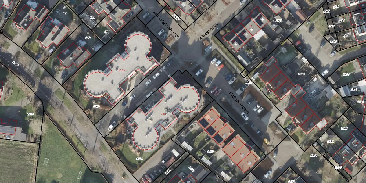 Het perceel waarop Allershoeve 17 staat heeft een oppervlakte van 1795 m². Dit is een zeer groot perceel. De perceeloppervlakte wordt geregistreerd door het Kadaster. Gedetailleerde informatie over de maten van dit perceel kunt u vinden in het rapport Kadastrale kaart met maatvoering van Allershoeve 17.