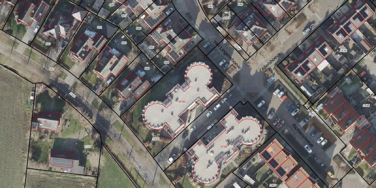 Het perceel waarop Allershoeve 18 staat heeft een oppervlakte van 1595 m². Dit is een zeer groot perceel. De perceeloppervlakte wordt geregistreerd door het Kadaster. Gedetailleerde informatie over de maten van dit perceel kunt u vinden in het rapport Kadastrale kaart met maatvoering van Allershoeve 18.