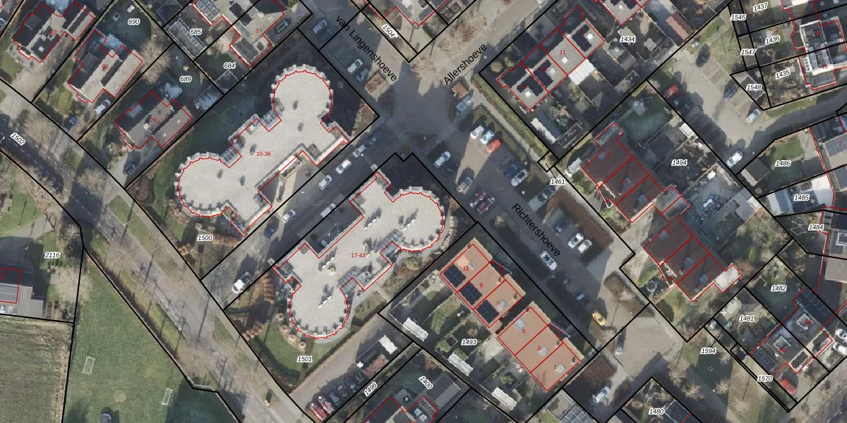 Het perceel waarop Allershoeve 19 staat heeft een oppervlakte van 1795 m². Dit is een zeer groot perceel. De perceeloppervlakte wordt geregistreerd door het Kadaster. Gedetailleerde informatie over de maten van dit perceel kunt u vinden in het rapport Kadastrale kaart met maatvoering van Allershoeve 19.