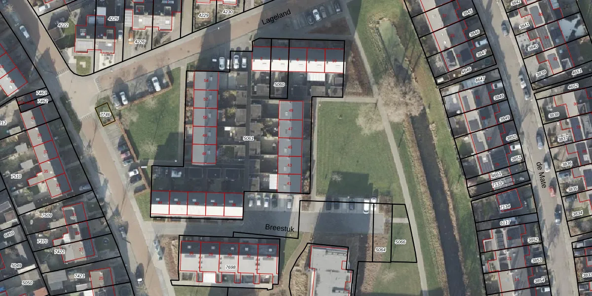 Het perceel waarop Breestuk 45 staat heeft een oppervlakte van 2477 m². Dit is een zeer groot perceel. De perceeloppervlakte wordt geregistreerd door het Kadaster. Gedetailleerde informatie over de maten van dit perceel kunt u vinden in het rapport Kadastrale kaart met maatvoering van Breestuk 45.