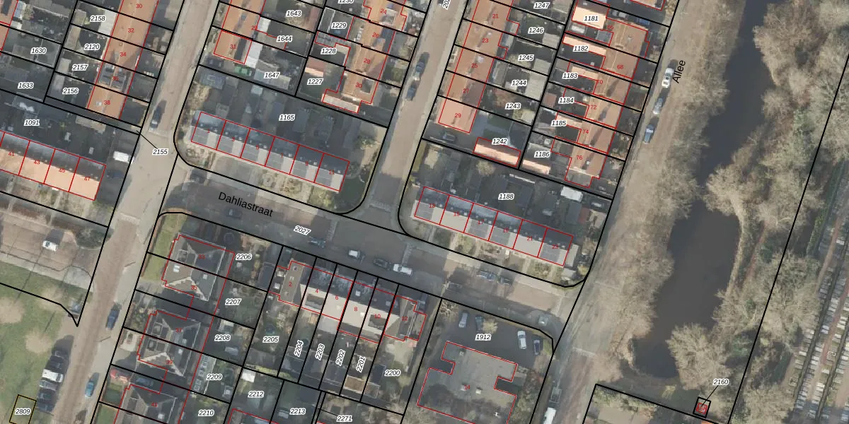Het perceel waarop Dahliastraat 13 staat heeft een oppervlakte van 1081 m². Dit is een zeer groot perceel. De perceeloppervlakte wordt geregistreerd door het Kadaster. Gedetailleerde informatie over de maten van dit perceel kunt u vinden in het rapport Kadastrale kaart met maatvoering van Dahliastraat 13.