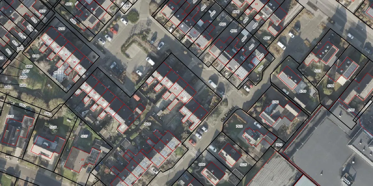 Het perceel waarop de Dinkel 19 staat heeft een oppervlakte van 3400 m². Dit is een zeer groot perceel. De perceeloppervlakte wordt geregistreerd door het Kadaster. Gedetailleerde informatie over de maten van dit perceel kunt u vinden in het rapport Kadastrale kaart met maatvoering van de Dinkel 19.