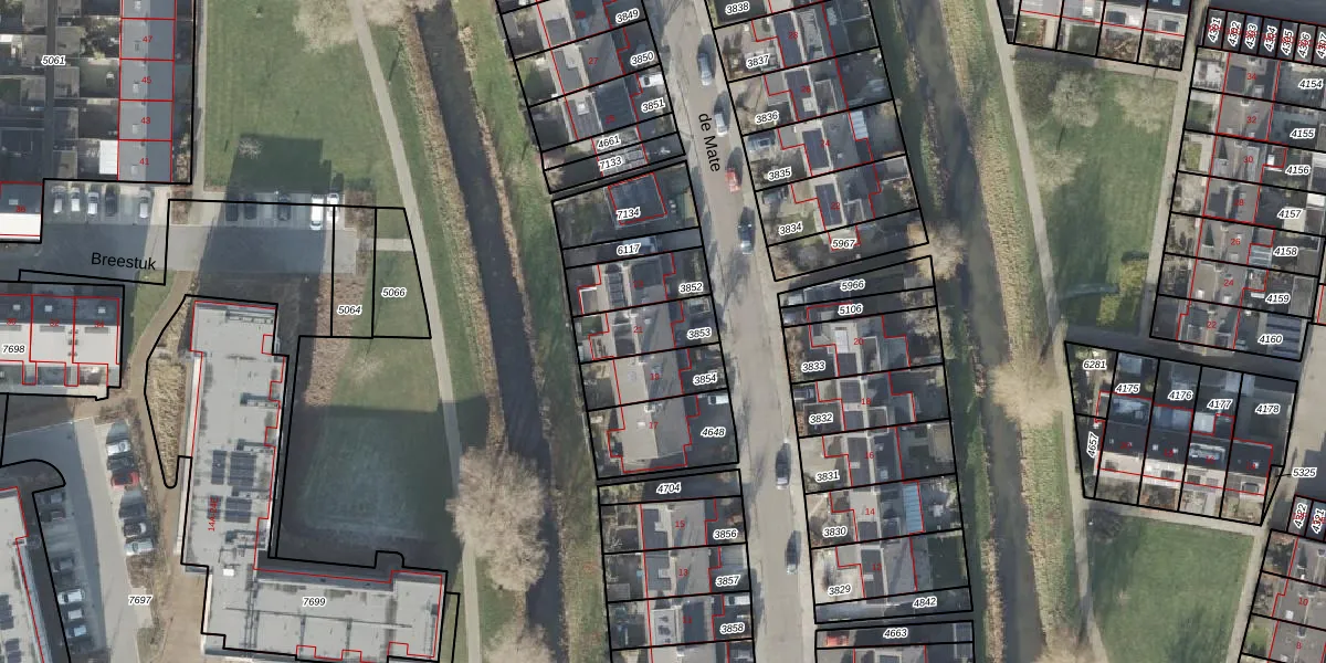 Het perceel waarop de Mate 21 staat heeft een oppervlakte van 157 m². Dit is een middelgroot perceel. De perceeloppervlakte wordt geregistreerd door het Kadaster. Gedetailleerde informatie over de maten van dit perceel kunt u vinden in het rapport Kadastrale kaart met maatvoering van de Mate 21.