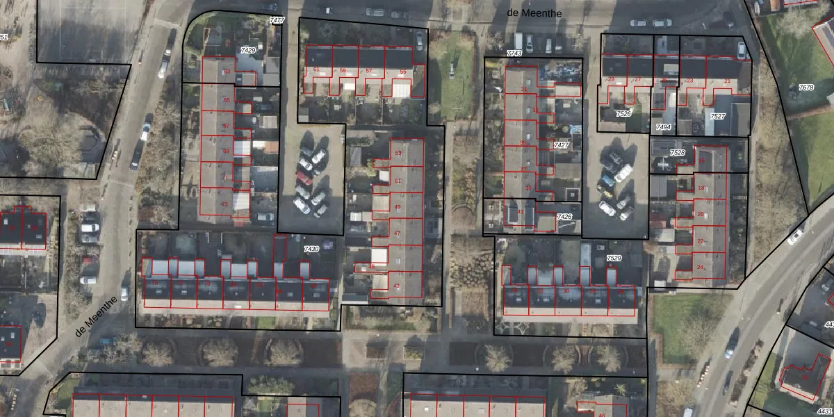 Het perceel waarop de Meenthe 49 staat heeft een oppervlakte van 3776 m². Dit is een zeer groot perceel. De perceeloppervlakte wordt geregistreerd door het Kadaster. Gedetailleerde informatie over de maten van dit perceel kunt u vinden in het rapport Kadastrale kaart met maatvoering van de Meenthe 49.