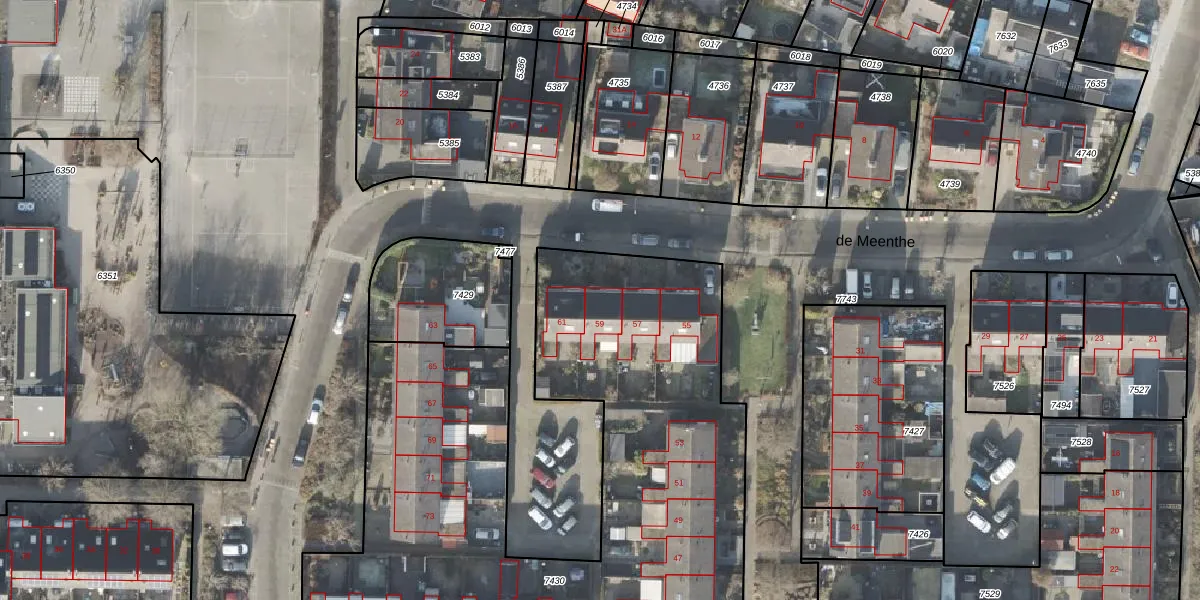 Het perceel waarop de Meenthe 59 staat heeft een oppervlakte van 3776 m². Dit is een zeer groot perceel. De perceeloppervlakte wordt geregistreerd door het Kadaster. Gedetailleerde informatie over de maten van dit perceel kunt u vinden in het rapport Kadastrale kaart met maatvoering van de Meenthe 59.