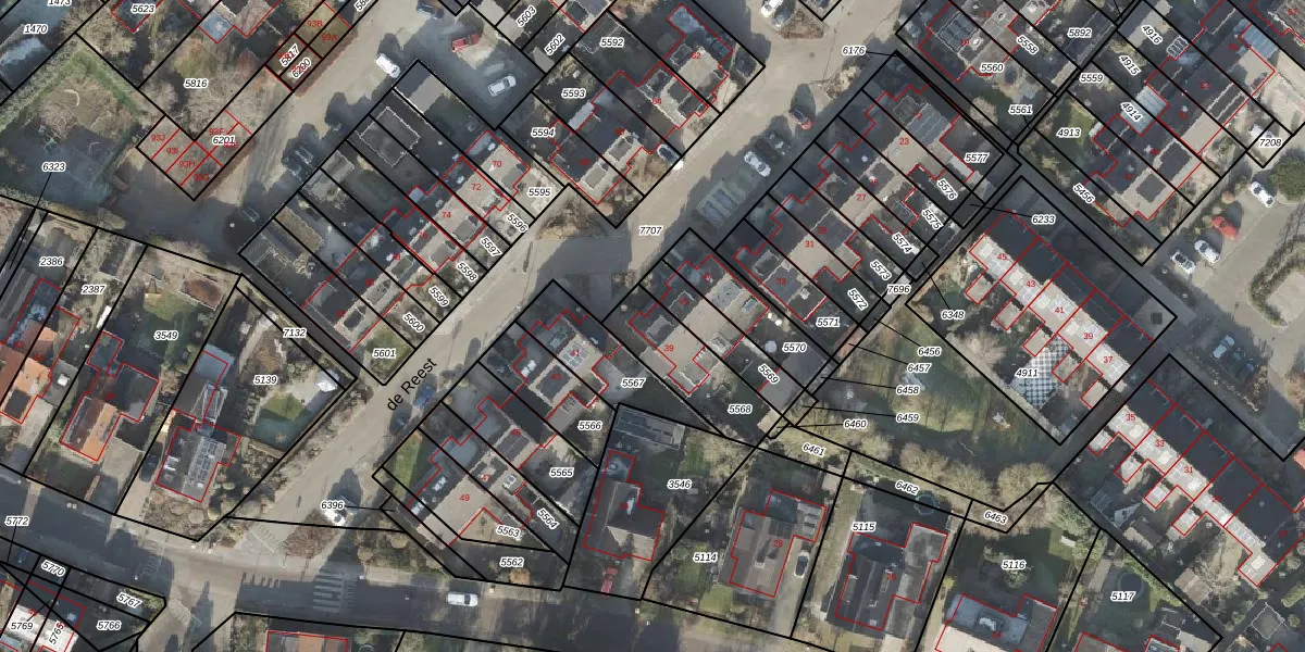 Het perceel waarop de Reest 39 staat heeft een oppervlakte van 250 m². Dit is een middelgroot perceel. De perceeloppervlakte wordt geregistreerd door het Kadaster. Gedetailleerde informatie over de maten van dit perceel kunt u vinden in het rapport Kadastrale kaart met maatvoering van de Reest 39.