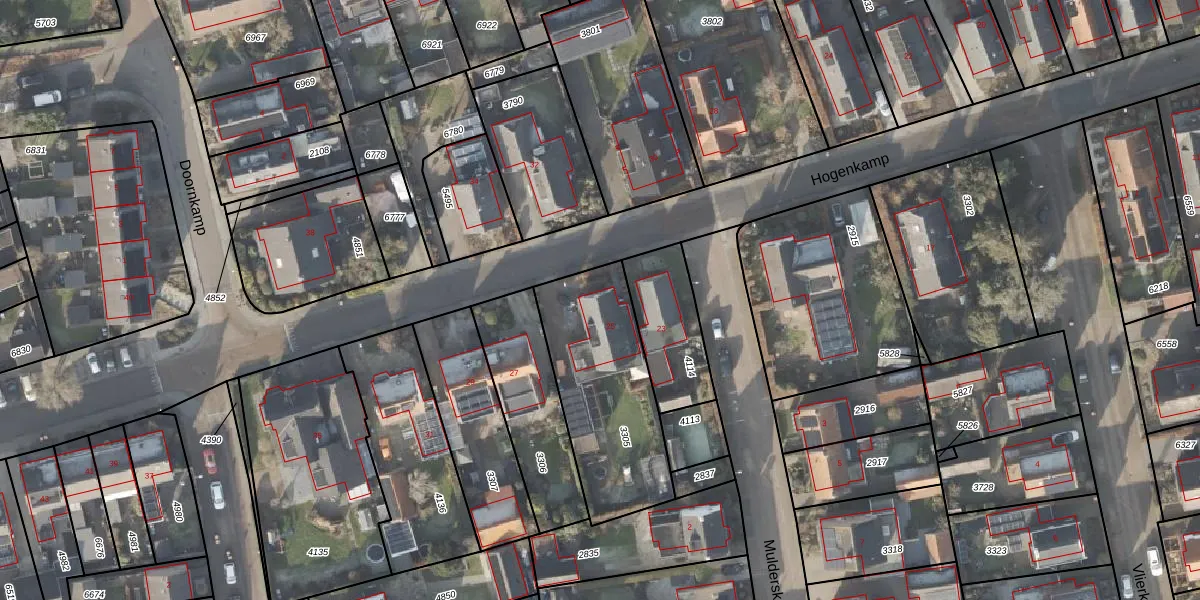 Het perceel waarop Hogenkamp 25 staat heeft een oppervlakte van 626 m². Dit is een groot perceel. De perceeloppervlakte wordt geregistreerd door het Kadaster. Gedetailleerde informatie over de maten van dit perceel kunt u vinden in het rapport Kadastrale kaart met maatvoering van Hogenkamp 25.