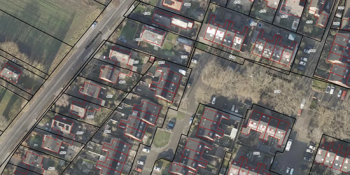 Het perceel waarop Keppelskamp 70 staat heeft een oppervlakte van 2945 m². Dit is een zeer groot perceel. De perceeloppervlakte wordt geregistreerd door het Kadaster. Gedetailleerde informatie over de maten van dit perceel kunt u vinden in het rapport Kadastrale kaart met maatvoering van Keppelskamp 70.