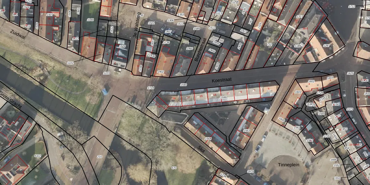 Het perceel waarop Koestraat 17 staat heeft een oppervlakte van 716 m². Dit is een groot perceel. De perceeloppervlakte wordt geregistreerd door het Kadaster. Gedetailleerde informatie over de maten van dit perceel kunt u vinden in het rapport Kadastrale kaart met maatvoering van Koestraat 17.