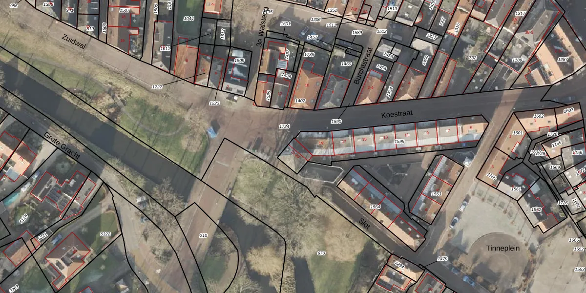 Het perceel waarop Koestraat 23 staat heeft een oppervlakte van 716 m². Dit is een groot perceel. De perceeloppervlakte wordt geregistreerd door het Kadaster. Gedetailleerde informatie over de maten van dit perceel kunt u vinden in het rapport Kadastrale kaart met maatvoering van Koestraat 23.