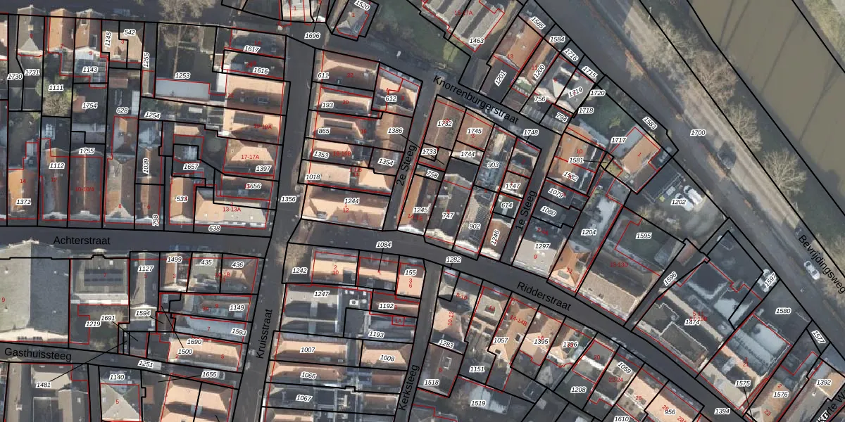 Het perceel waarop Ridderstraat 1-E staat heeft een oppervlakte van 98 m². Dit is een klein perceel. De perceeloppervlakte wordt geregistreerd door het Kadaster. Gedetailleerde informatie over de maten van dit perceel kunt u vinden in het rapport Kadastrale kaart met maatvoering van Ridderstraat 1-E.