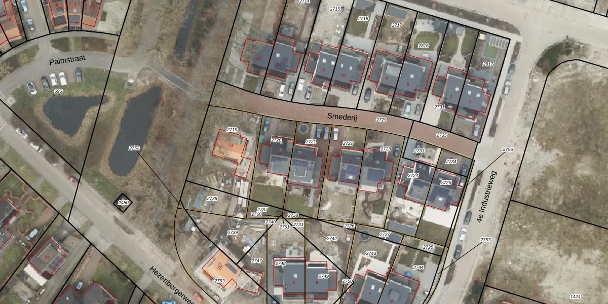 Het perceel waarop Smederij 9 staat heeft een oppervlakte van 353 m². Dit is een groot perceel. De perceeloppervlakte wordt geregistreerd door het Kadaster. Gedetailleerde informatie over de maten van dit perceel kunt u vinden in het rapport Kadastrale kaart met maatvoering van Smederij 9.