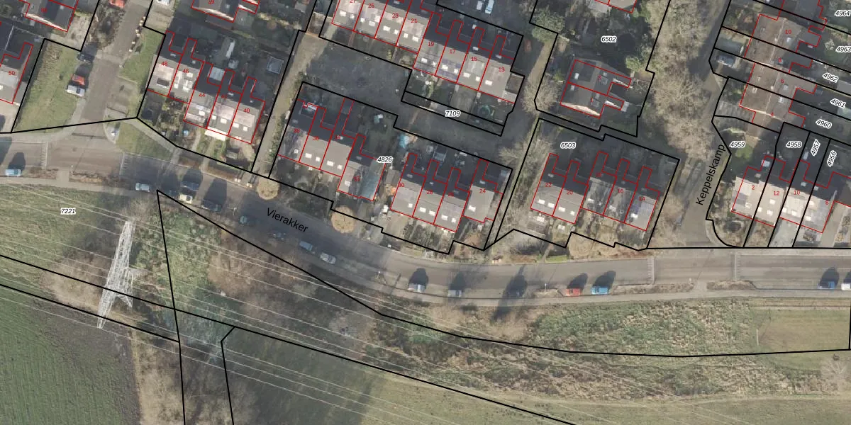 Het perceel waarop Vierakker 28 staat heeft een oppervlakte van 1275 m². Dit is een zeer groot perceel. De perceeloppervlakte wordt geregistreerd door het Kadaster. Gedetailleerde informatie over de maten van dit perceel kunt u vinden in het rapport Kadastrale kaart met maatvoering van Vierakker 28.