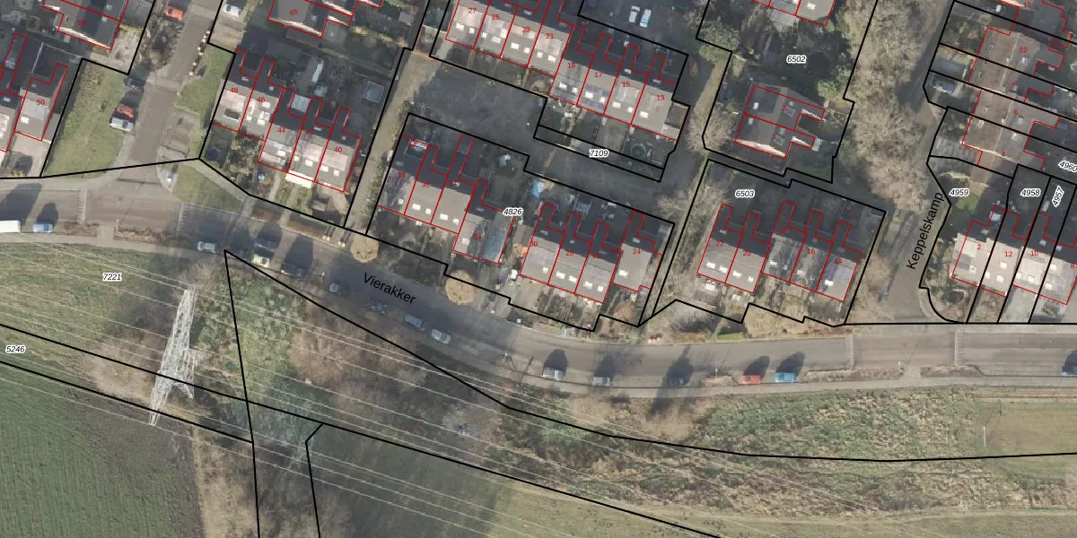 Het perceel waarop Vierakker 30 staat heeft een oppervlakte van 1275 m². Dit is een zeer groot perceel. De perceeloppervlakte wordt geregistreerd door het Kadaster. Gedetailleerde informatie over de maten van dit perceel kunt u vinden in het rapport Kadastrale kaart met maatvoering van Vierakker 30.