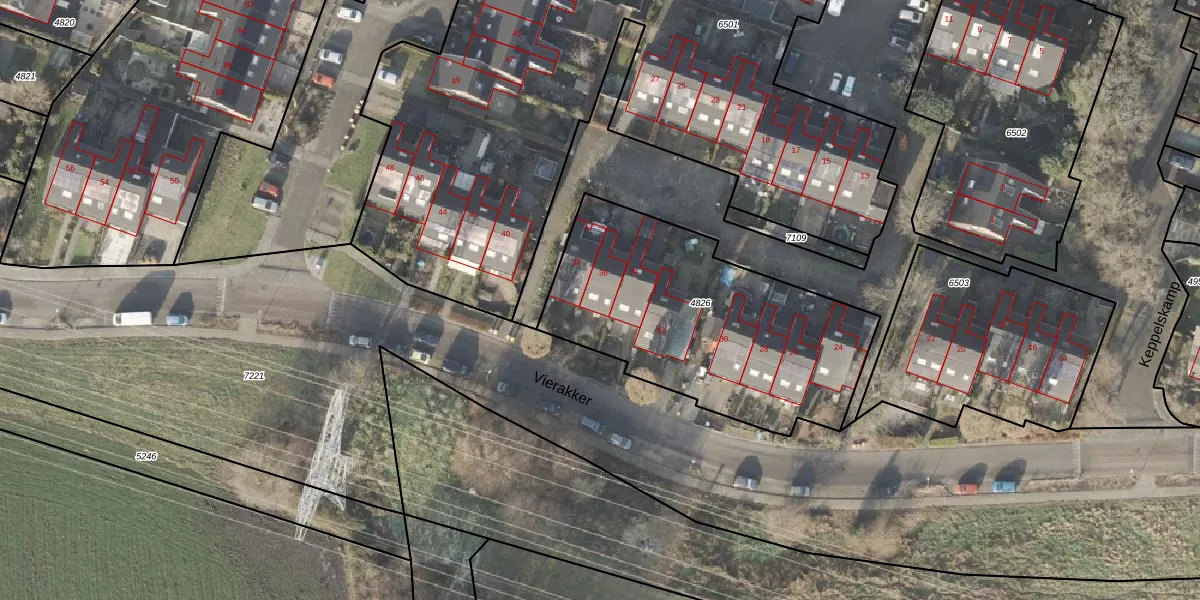 Het perceel waarop Vierakker 36 staat heeft een oppervlakte van 1275 m². Dit is een zeer groot perceel. De perceeloppervlakte wordt geregistreerd door het Kadaster. Gedetailleerde informatie over de maten van dit perceel kunt u vinden in het rapport Kadastrale kaart met maatvoering van Vierakker 36.