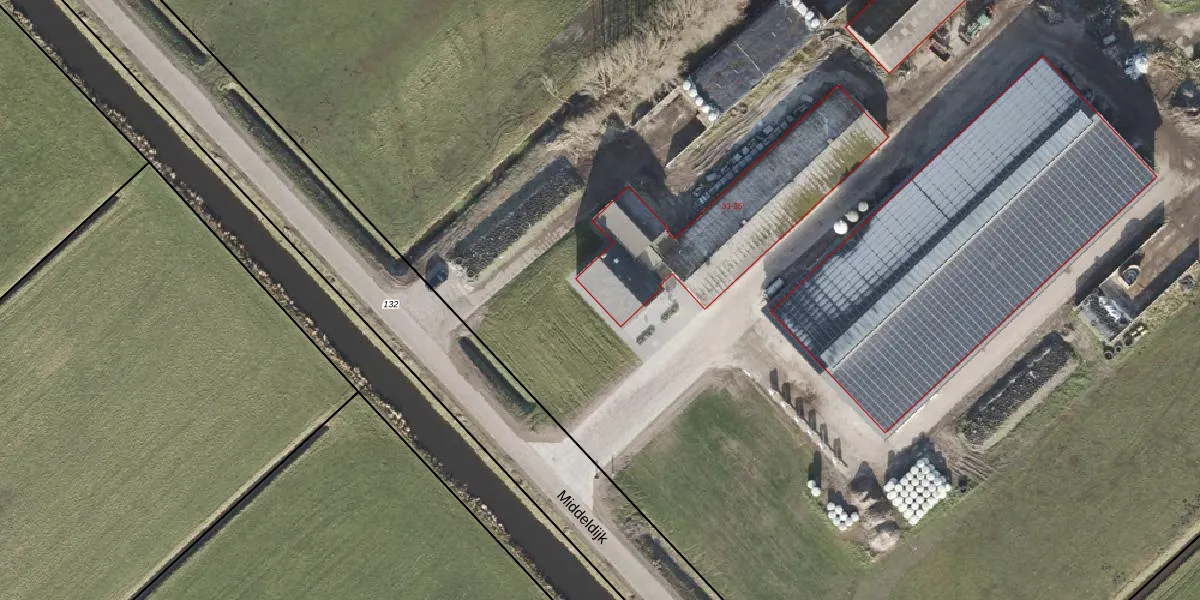 Het perceel waarop Middeldijk 33 staat heeft een oppervlakte van 11,7 ha. Dit is een zeer groot perceel. De perceeloppervlakte wordt geregistreerd door het Kadaster. Gedetailleerde informatie over de maten van dit perceel kunt u vinden in het rapport Kadastrale kaart met maatvoering van Middeldijk 33.