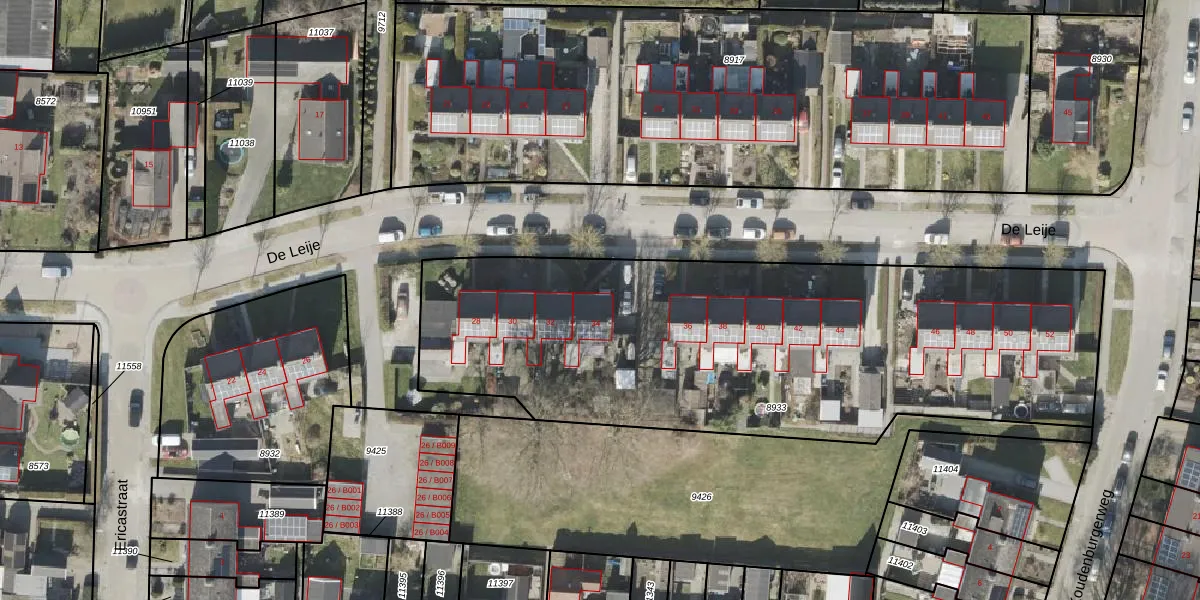 Het perceel waarop De Leije 34 staat heeft een oppervlakte van 3014 m². Dit is een zeer groot perceel. De perceeloppervlakte wordt geregistreerd door het Kadaster. Gedetailleerde informatie over de maten van dit perceel kunt u vinden in het rapport Kadastrale kaart met maatvoering van De Leije 34.