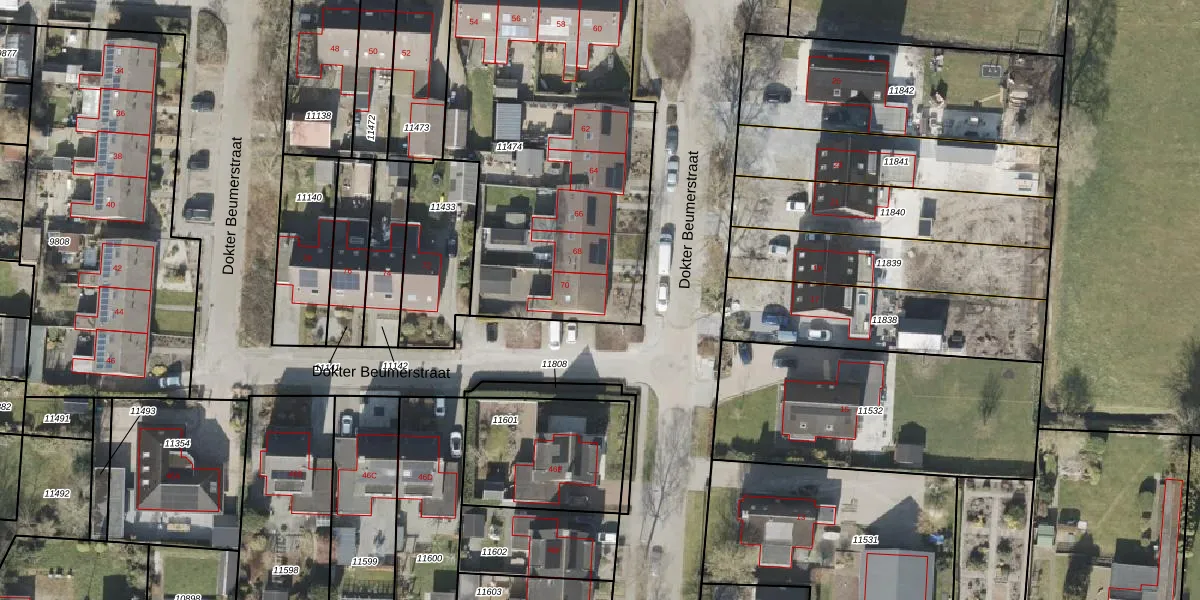 Het perceel waarop Dokter Beumerstraat 70 staat heeft een oppervlakte van 1815 m². Dit is een zeer groot perceel. De perceeloppervlakte wordt geregistreerd door het Kadaster. Gedetailleerde informatie over de maten van dit perceel kunt u vinden in het rapport Kadastrale kaart met maatvoering van Dokter Beumerstraat 70.