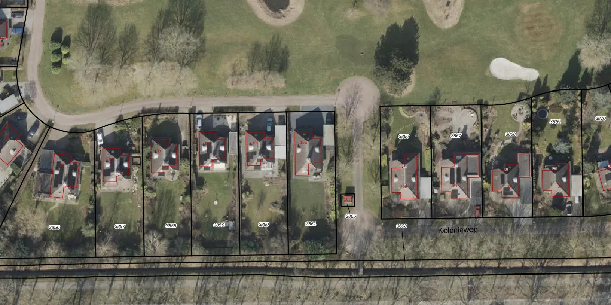 Kolonieweg 103 is gelegen op kadastraal perceel HVT03I3861. Deze kadastrale aanduiding is uniek en wordt gebruikt door het Kadaster om eigendomsrechten en andere zakelijke rechten vast te leggen. Het perceel maakt onderdeel uit van de kadastrale gemeente Havelte.
