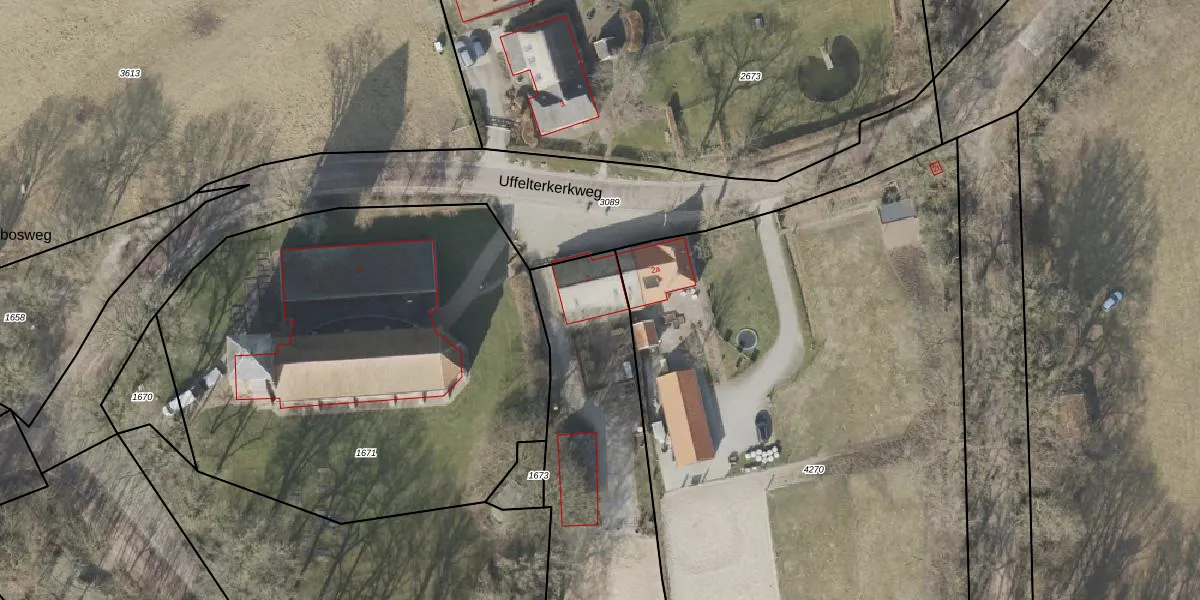 Het perceel waarop Uffelterkerkweg 2 staat heeft een oppervlakte van 8590 m². Dit is een zeer groot perceel. De perceeloppervlakte wordt geregistreerd door het Kadaster. Gedetailleerde informatie over de maten van dit perceel kunt u vinden in het rapport Kadastrale kaart met maatvoering van Uffelterkerkweg 2.