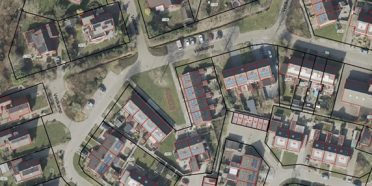 Het perceel waarop Veldkamp 23 staat heeft een oppervlakte van 2120 m². Dit is een zeer groot perceel. De perceeloppervlakte wordt geregistreerd door het Kadaster. Gedetailleerde informatie over de maten van dit perceel kunt u vinden in het rapport Kadastrale kaart met maatvoering van Veldkamp 23.
