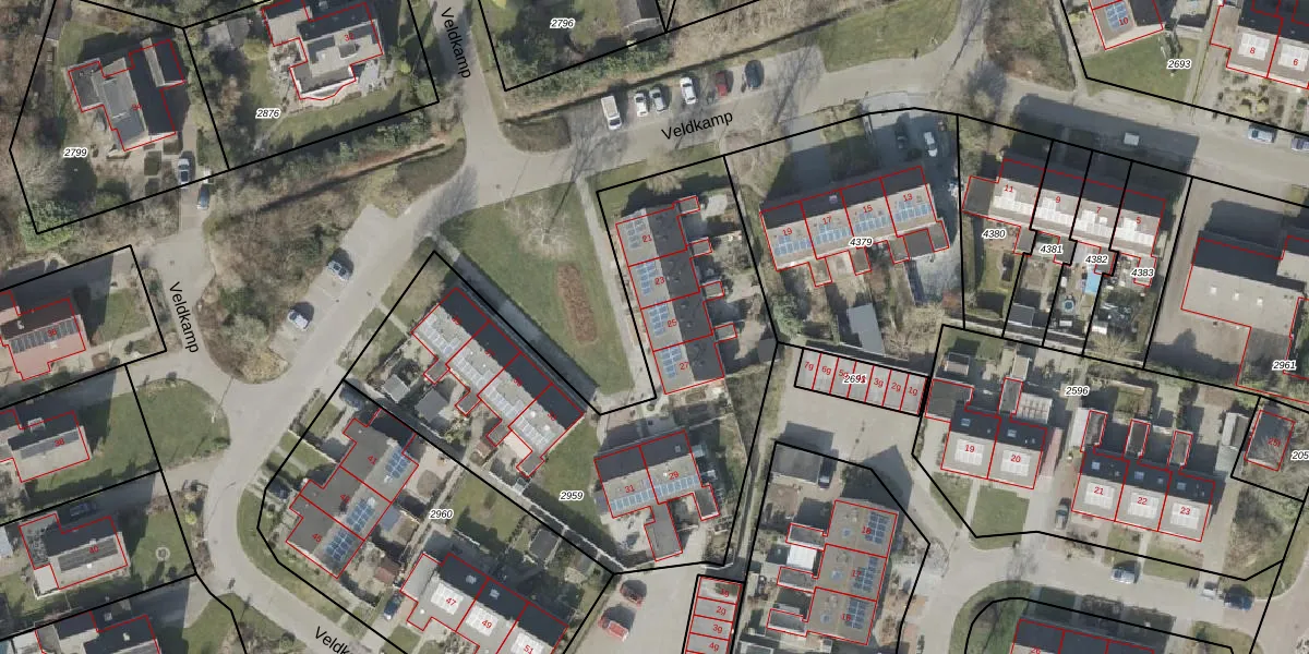 Het perceel waarop Veldkamp 25 staat heeft een oppervlakte van 2120 m². Dit is een zeer groot perceel. De perceeloppervlakte wordt geregistreerd door het Kadaster. Gedetailleerde informatie over de maten van dit perceel kunt u vinden in het rapport Kadastrale kaart met maatvoering van Veldkamp 25.