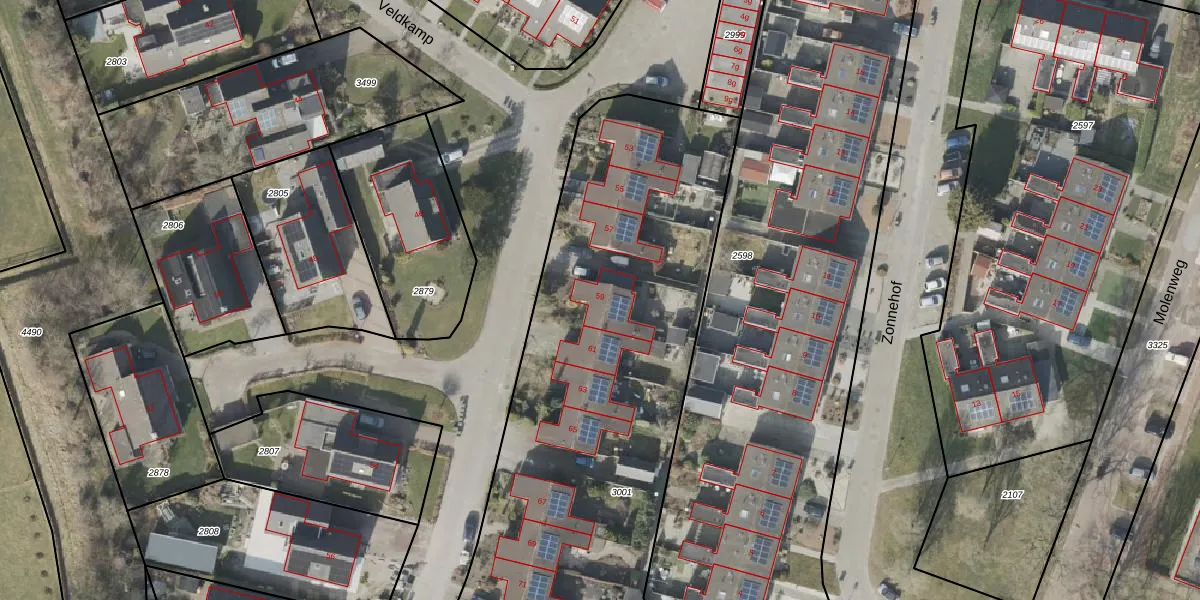 Het perceel waarop Veldkamp 59 staat heeft een oppervlakte van 2527 m². Dit is een zeer groot perceel. De perceeloppervlakte wordt geregistreerd door het Kadaster. Gedetailleerde informatie over de maten van dit perceel kunt u vinden in het rapport Kadastrale kaart met maatvoering van Veldkamp 59.