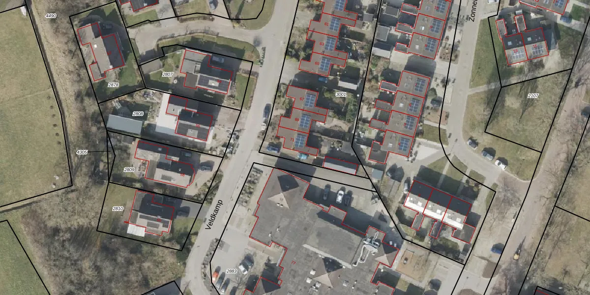 Het perceel waarop Veldkamp 71 staat heeft een oppervlakte van 2527 m². Dit is een zeer groot perceel. De perceeloppervlakte wordt geregistreerd door het Kadaster. Gedetailleerde informatie over de maten van dit perceel kunt u vinden in het rapport Kadastrale kaart met maatvoering van Veldkamp 71.