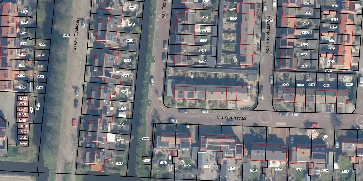 Het perceel waarop Jan Steenstraat 41 staat heeft een oppervlakte van 2367 m². Dit is een zeer groot perceel. De perceeloppervlakte wordt geregistreerd door het Kadaster. Gedetailleerde informatie over de maten van dit perceel kunt u vinden in het rapport Kadastrale kaart met maatvoering van Jan Steenstraat 41.