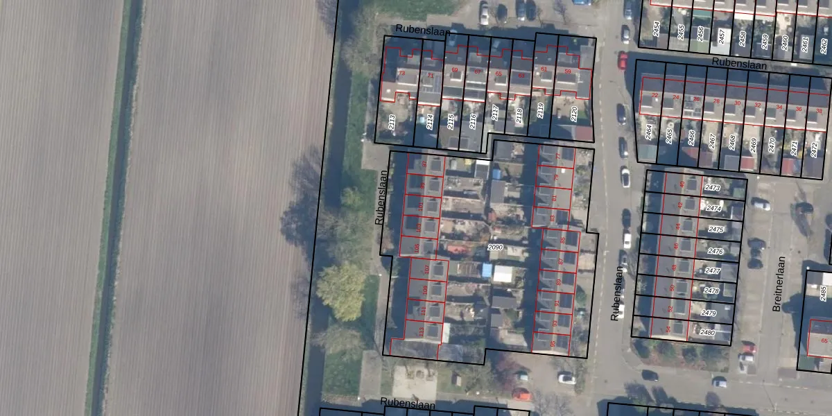 Het perceel waarop Rubenslaan 101 staat heeft een oppervlakte van 2466 m². Dit is een zeer groot perceel. De perceeloppervlakte wordt geregistreerd door het Kadaster. Gedetailleerde informatie over de maten van dit perceel kunt u vinden in het rapport Kadastrale kaart met maatvoering van Rubenslaan 101.
