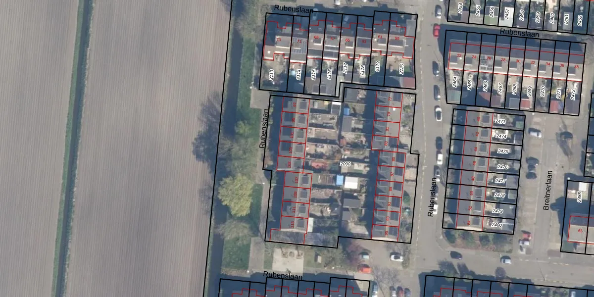 Het perceel waarop Rubenslaan 103 staat heeft een oppervlakte van 2466 m². Dit is een zeer groot perceel. De perceeloppervlakte wordt geregistreerd door het Kadaster. Gedetailleerde informatie over de maten van dit perceel kunt u vinden in het rapport Kadastrale kaart met maatvoering van Rubenslaan 103.