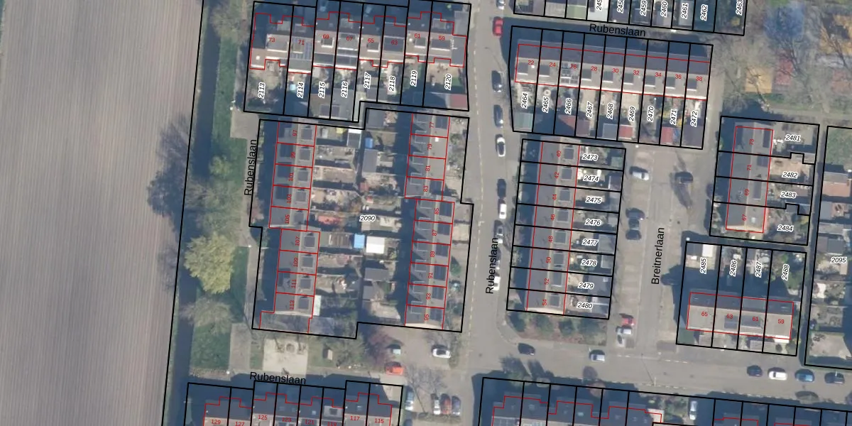 Het perceel waarop Rubenslaan 85 staat heeft een oppervlakte van 2466 m². Dit is een zeer groot perceel. De perceeloppervlakte wordt geregistreerd door het Kadaster. Gedetailleerde informatie over de maten van dit perceel kunt u vinden in het rapport Kadastrale kaart met maatvoering van Rubenslaan 85.