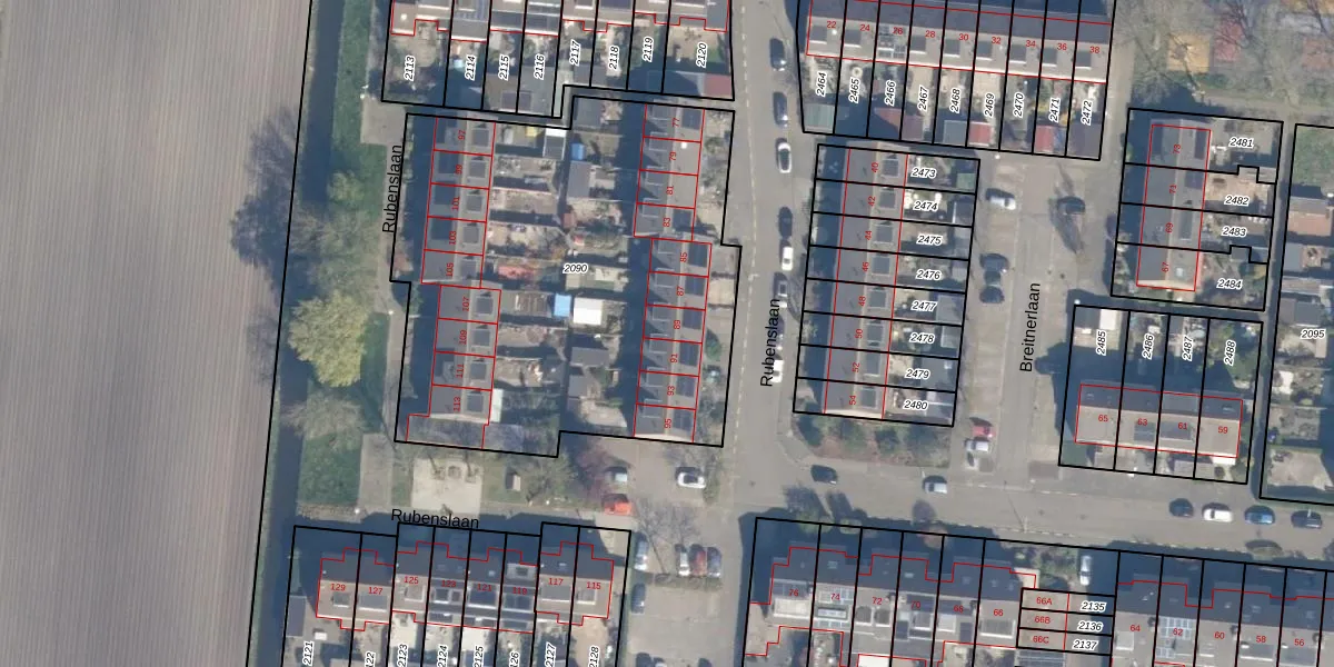 Het perceel waarop Rubenslaan 89 staat heeft een oppervlakte van 2466 m². Dit is een zeer groot perceel. De perceeloppervlakte wordt geregistreerd door het Kadaster. Gedetailleerde informatie over de maten van dit perceel kunt u vinden in het rapport Kadastrale kaart met maatvoering van Rubenslaan 89.